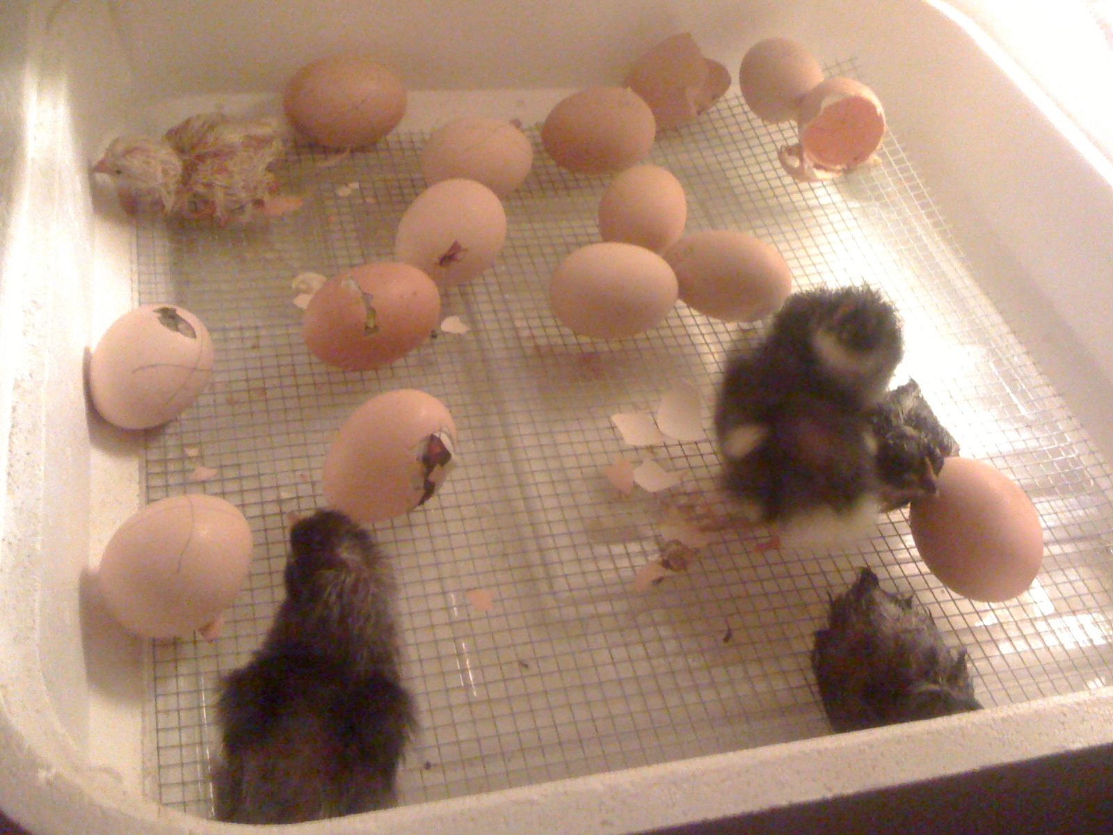 A few days before the expected date-of-arrival for the little chics, the eggs are taken out of the containment rack and placed on metal mesh at the bottom of the incubator. This insures enough room for the baby chics to squirm around and the metal mesh allows the waste to fall through so the birds aren't lying in it. Also at this time the humidity is increased and the temperature slightly adjusted.
